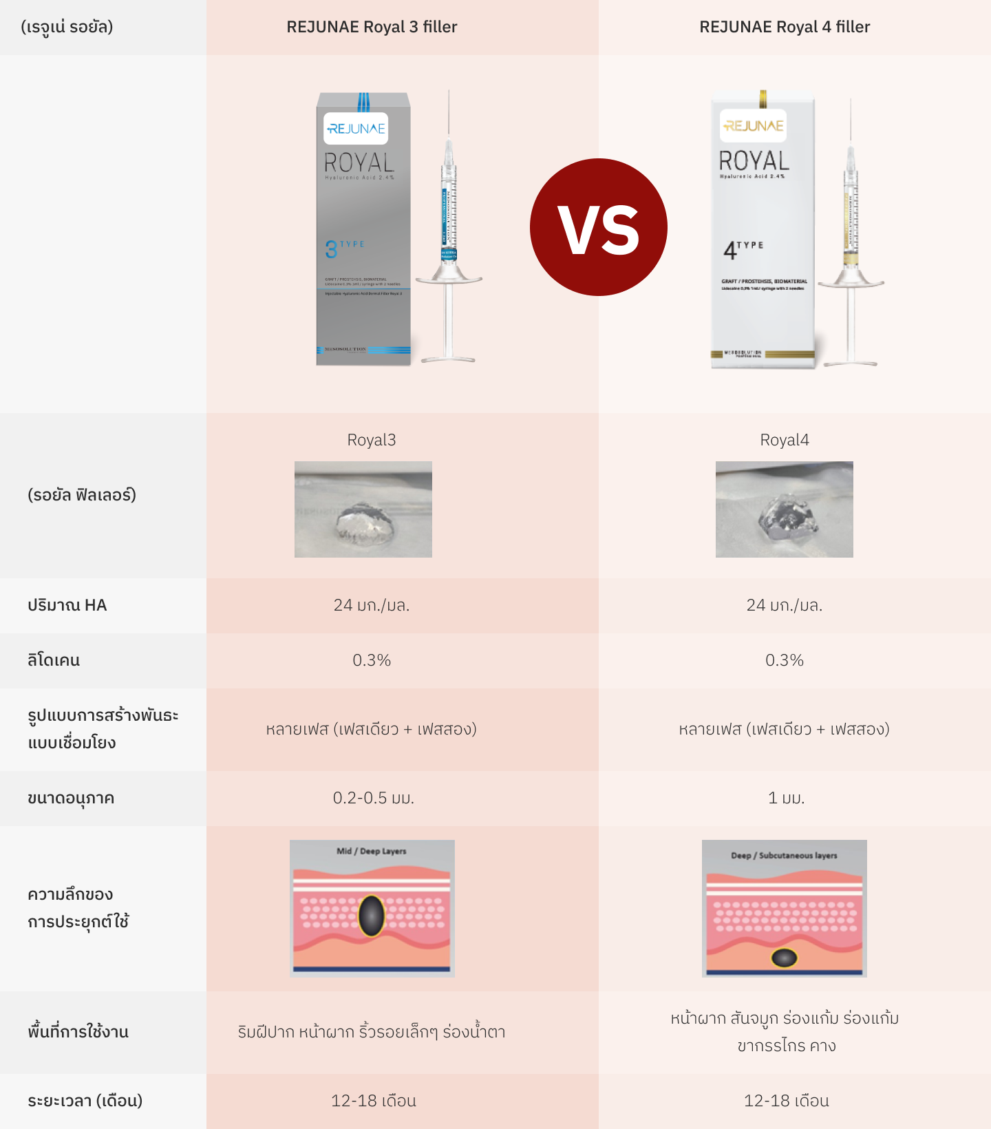 ฟิลเลอร์ Rejunae Royal (เรจูเน่ รอยัล) ใช้เทคโนโลยีขั้นสูงเพื่อลดขนาดโมเลกุลและลดปริมาณ BDDE ซึ่งช่วยลดความเสี่ยงของผลข้างเคียง ส่งผลให้ได้ผลลัพธ์ที่ยาวนานและบวมน้อยที่สุด